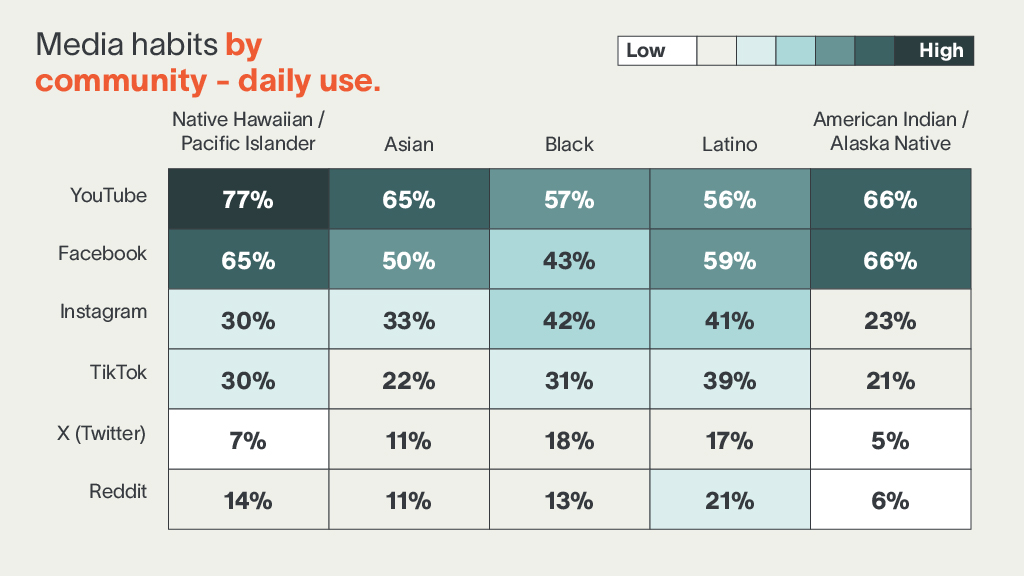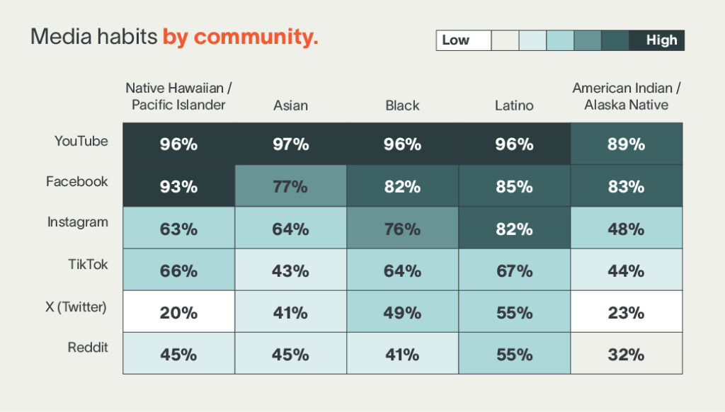 Customization is key to a successful campaign channel strategy. To best reach Asian, American Indian/Alaska Native, Black, Latino, and Native Hawaiian/Pacific Islanders in the Pacific Northwest via social media, here are a few additional findings to help guide your strategy: