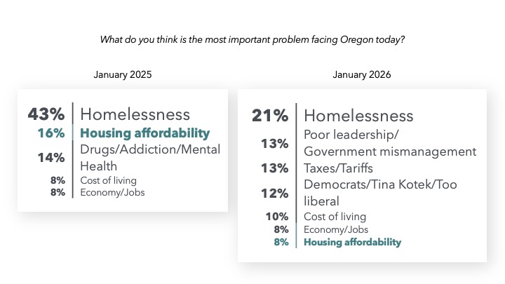 Throughout last year, Oregonians identified housing affordability as the second most important problem facing the state, second only to homelessness. Now, in early 2026, many Oregonians still say housing affordability is the most important issue, with related issues of the economy, cost of living, taxes, and government mismanagement rising in importance. Homelessness remains the top issue. This suggests that, over the past few months, while housing affordability remained on the radar, both homelessness and housing affordability became lower priorities as frustration with the government and economic concerns rose. By extension, many Oregonians may prioritize solutions for middle-income and workforce community members over low-income housing.