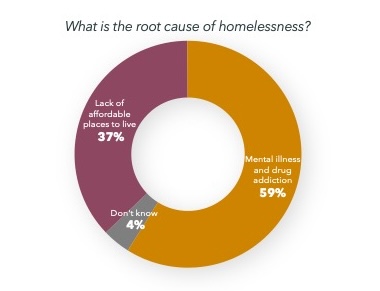 Over the last decade, DHM has asked Oregonians from time to time what they believe is the primary cause of homelessness. Most recently, in 2023, the majority of Oregonians said homelessness is mostly the result of mental illness and drug addiction, compared to less than 4 in 10 who thought it was primarily the result of a lack of affordable places to live (the rest were unsure). This shows that even while many people continue to say that homelessness is Oregon’s most important problem, fewer people prioritize housing affordability as the primary solution.